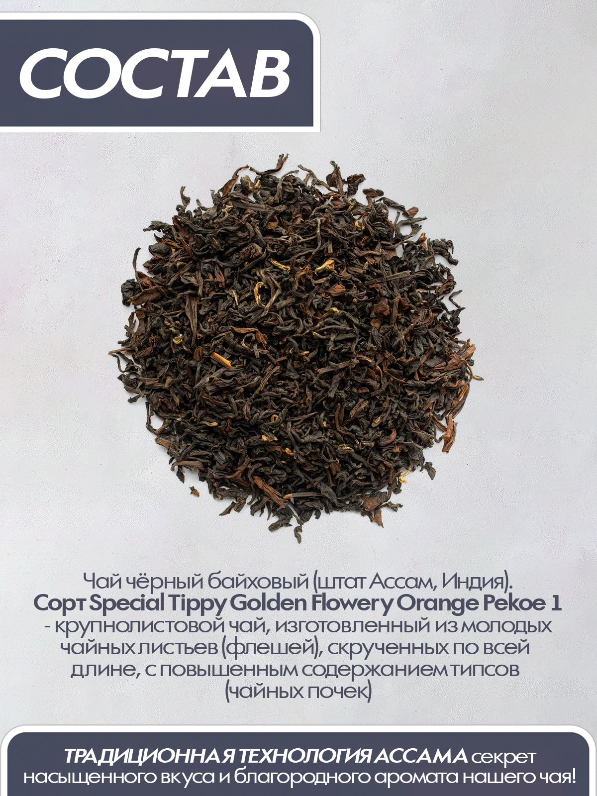 Состав: чай черный байховый (штат Ассам, Индия). Сорт Special Tippy Golden Flowery Orange Pekoe 1 - крупнолистовой чай, изготовленный из молодых чайных листьев (флешей), скрученных по всей длине, c повышенным содержанием типсов (чайных почек)